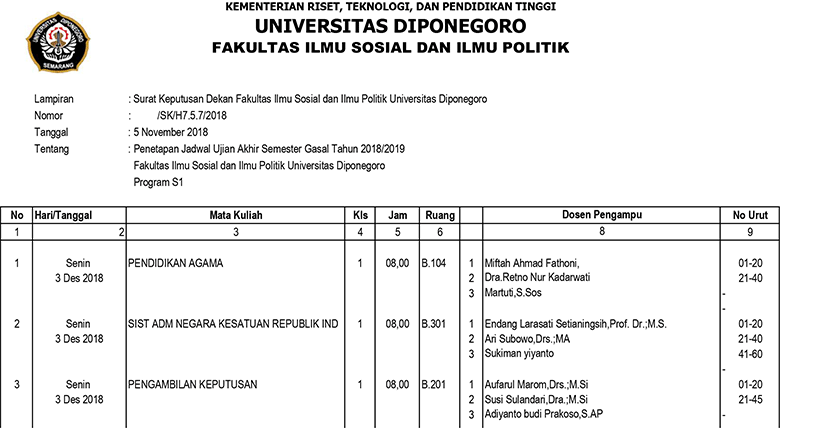 Jadwal Ujian Akhir Semester Gasal Tahun 2018/2019 (S1)
