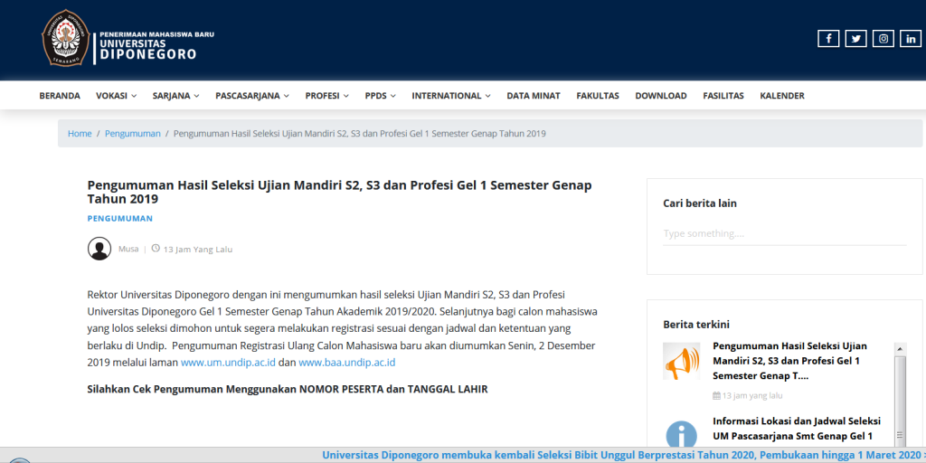 Rektor Universitas Diponegoro dengan ini mengumumkan hasil seleksi Ujian Mandiri S2, S3 dan Profesi Universitas Diponegoro Gel 1 Semester Genap Tahun Akademik 2019/2020. Selanjutnya bagi calon mahasiswa yang lolos seleksi dimohon untuk segera melakukan registrasi sesuai dengan jadwal dan ketentuan yang berlaku di Undip. Pengumuman Registrasi Ulang Calon Mahasiswa baru akan diumumkan Senin, 2 Desember […]
