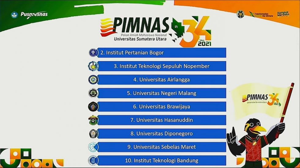 Serangkaian kegiatan Pekan Ilmiah Mahasiswa Nasional (PIMNAS) ke-34 tahun 2021 yang diselenggarakan sejak tanggal 25 Oktober hingga 29 Oktober 2021 oleh Kementerian Pendidikan, Kebudayaan, Riset, dan Teknologi (Kemendikbudristek) telah sampai pada puncaknya. Closing ceremony PIMNAS ke-34 digelar secara luring terbatas di Universitas Sumatera Utara (USU) dan juga secara daring melalui kanal Youtube USU, Jum’at (29/10) […]