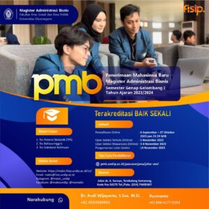 Prodi Magister Administrasi Bisnis kembali membuka Seleksi Penerimaan Mahasiswa Baru melalui Ujian Mandiri Pascasarjana Semester Genap Gelombang 1 pada Tahun Akademik 2023/2024. Seleksi diselenggarakan secara terpadu di sistem pendaftaran Ujian Mandiri, yang dikelola oleh Lembaga Pengembangan dan Penjaminan Mutu Pendidikan (LP2MP) Universitas Diponegoro. Pendaftaran Online Pendaftaran Online : 6 September – 27