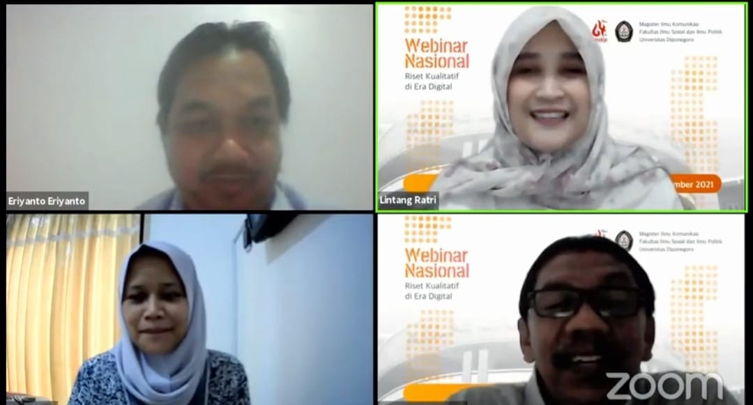 Master of Communication Science, Faculty of Social and Political Sciences, Universitas Diponegoro held a National Webinar “Qualitative Research in the Digital Era” (29/9). The event presented several keynote speakers namely Dr. Eriyanto (Lecturer of Universitas Indonesia /Communication Research Expert/Author of “Communication Network Analysis”), Dr. Turnomo Rahardjo (Lecturer of the Communication Science Undip) and it was moderated by Dr. Lintang Ratri Rahmiaji, S.Sos., M.Si (Lecturer of the Communication Science Undip).