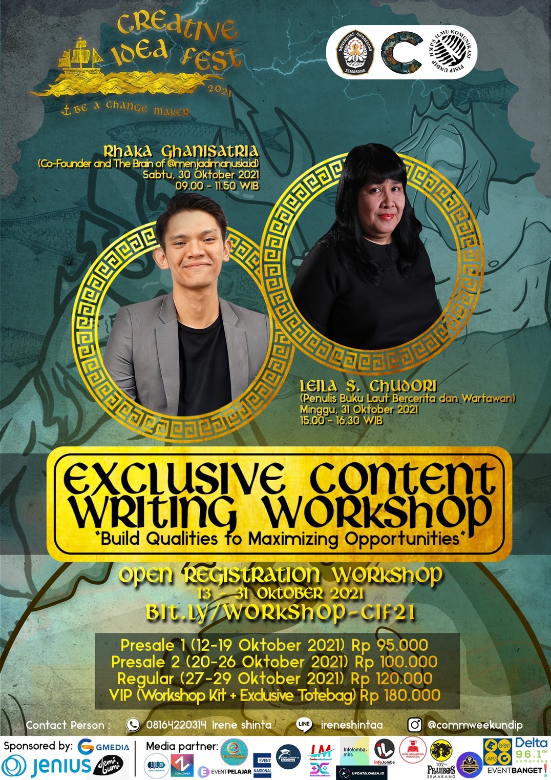 Digital Exclusive Content Writing Workshop Flyer by Creative Idea Fest 2021 (30/10/2021) Semarang—Creative Idea Fest (CIF) is one of a series of events in Commweek 2021 which consists of three contests in the creative field, namely marketing communication, advertising video production, and broadcasting. The highlight of the CIF event this time was a webinar and […]