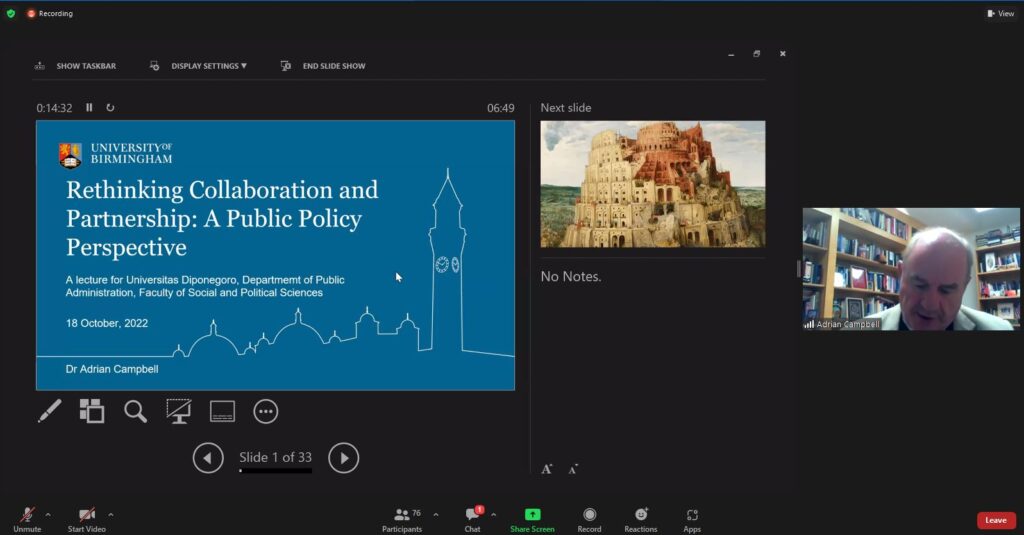 Semarang (18/10) – Master of Public Administration, Faculty of Social and Political Sciences, Universitas Diponegoro has just held a Visiting Lecturer activity with the theme Rethinking Collaboration and Partnership: A Public Policy Perspective. The activity, which took place on Tuesday, October 18, 2022, was carried out through a Zoom meeting and was attended by the […]
