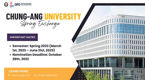 Semarang, io.undip.ac.id – Diponegoro International Office is pleased to inform our students, that Chung-Ang University (CAU) is now open registration for the exchange program. This program will be held during Spring Semester 2023 (March 2023 – June 2023) for a semester program and Spring-Fall Semester 2023 (March 2023 – December 2023) for two semesters.