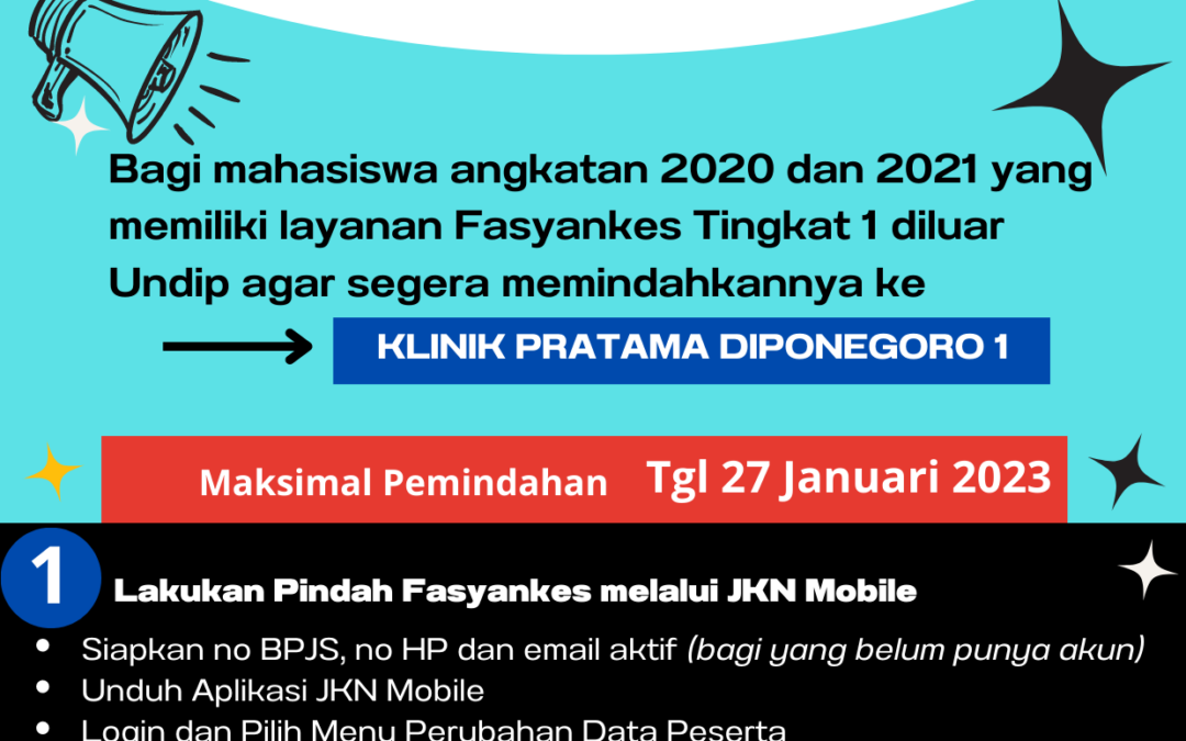 To respond to the announcement of the Rector of Universitas Diponegoro Number 2 / UN7.A1 / KM / I /2023, we hereby convey the information related to the transfer of Health Service Facilities (Fasyankes) to Klinik Pratama Diponegoro I for students of 2020 and 2021 classes, the complete information can be downloaded HERE