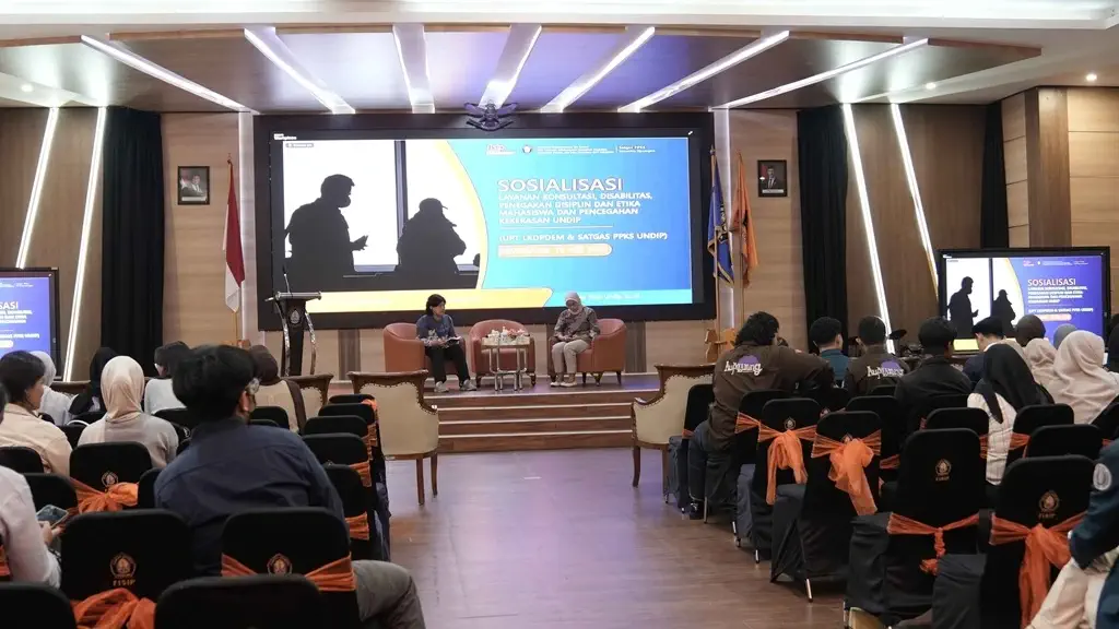 Semarang (15/05) – Universitas Diponegoro (Undip), through its Technical Implementation Unit for Disability Consultation Services, Discipline Enforcement & Student Ethics (LKDPDEM) and Task Force for Violence Prevention & Handling (PPK), conducted an outreach session on counselling services, disciplinary enforcement, and violence reporting mechanisms on campus. The event took place on Thursday, May 15, 2025, at the FIMENA Auditorium, 3rd Floor of Building A, FISIP Undip, Tembalang, featuring speakers such as Dr. Annastasia Ediati, S.Psi., M.Sc., Ph.D. (UPT LKDPDEM) and Dr. Manik Mahachandra (Undip PPK Task Force). The session aimed to strengthen students’ understanding of their rights and responsibilities, as well as procedures for addressing ethical violations and violence on campus.