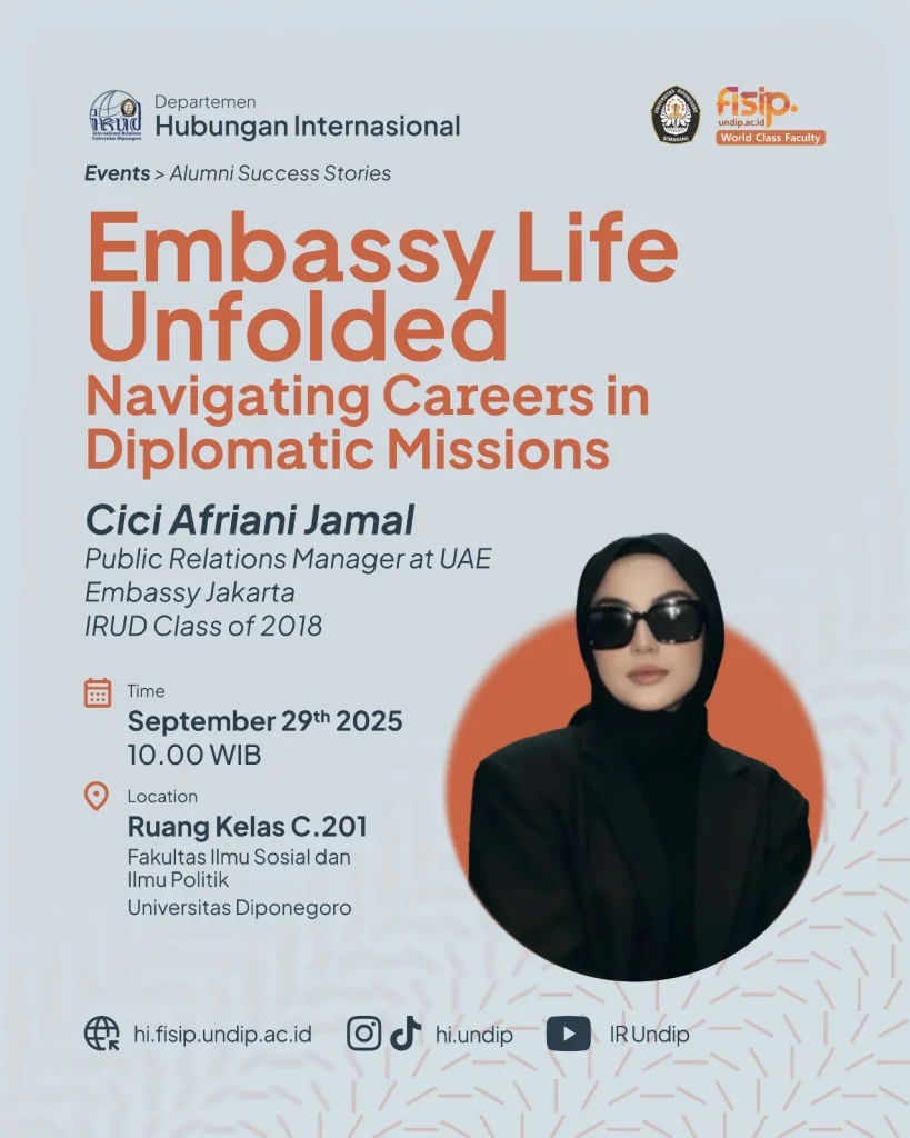 Universitas Diponegoro, 29 September 2025. The Department of International Relations at Universitas Diponegoro once again presented an inspiring figure in the Alumni Teaching activity entitled ‘Embassy Life Unfolded: Navigating Careers in Diplomatic Missions.’ In this session, Cici Afriani Jamal, S.Sos, shared her experiences regarding the various dynamics of life in the diplomatic world, from the […]
