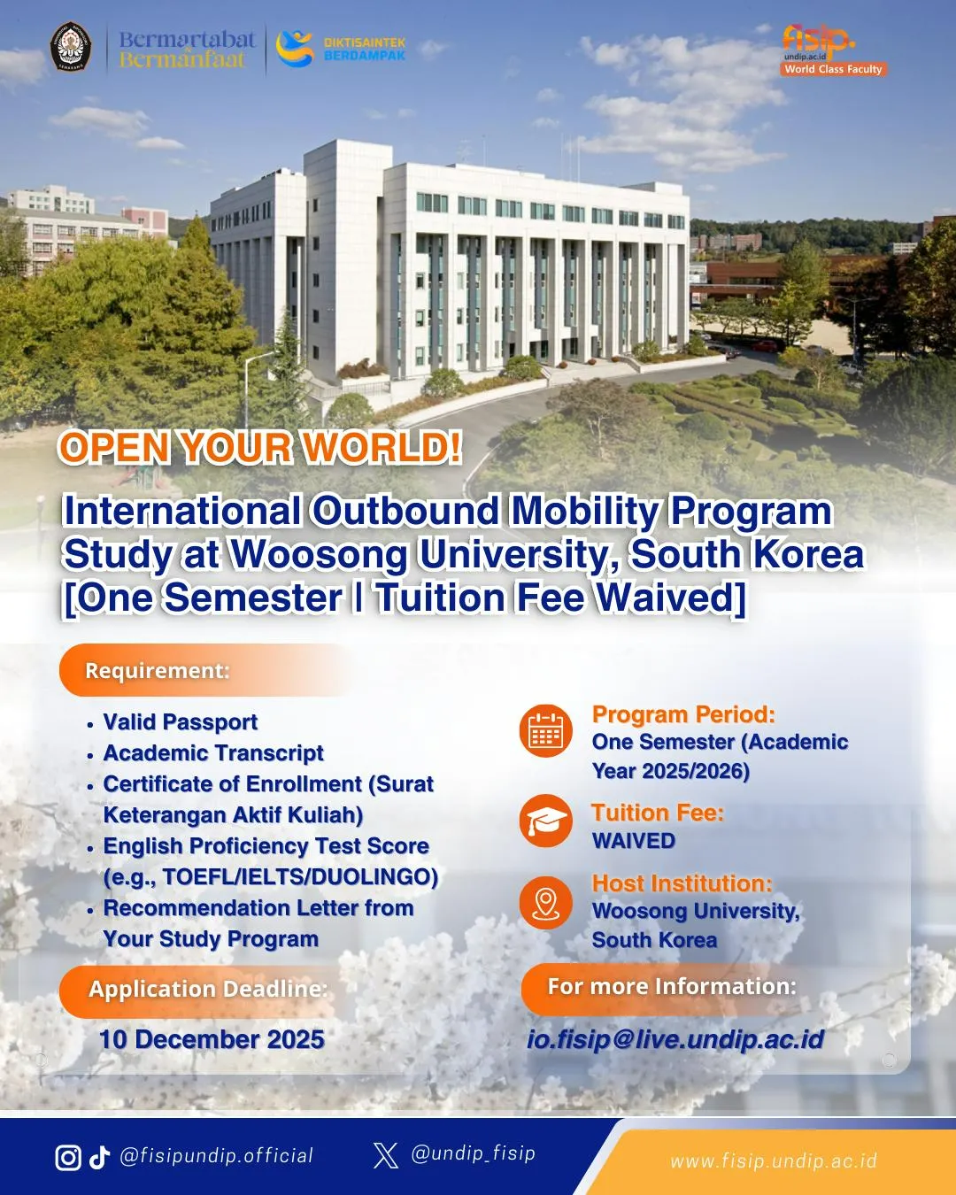 SEMARANG, Indonesia – The Faculty of Social and Political Sciences (FISIP) at Universitas Diponegoro (Undip) has announced an exciting opportunity for its students to study abroad for one semester at Woosong University in South Korea with all tuition fees waived.