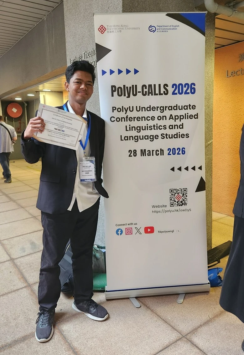 One of the Communication Science students of the Faculty of Social and Political Sciences, Diponegoro University, Isack Josua Sasmita Siahaan, had the opportunity to present his research abstract at an international conference entitled PolyU-CALLS (PolyU Undergraduate Conference on Applied Linguistics and Language Studies). This conference was organized by the Department of English and Communication, The Hong Kong Polytechnic University, on March 28, 2026, in Hong Kong. The aim of the conference was to provide undergraduate students with a platform to showcase and present their ongoing scientific research to a global academic audience.