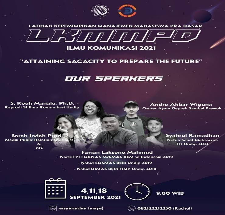 Poster LKMMPD Communication Science of 2021 (Source: Aurelia Almanda) Semarang—Communication Sciences Study Program has successfully held a Pre-Basic Student Management Leadership Exercise (LKMMPD) for new students of 2021. The space theme was complemented by space ornaments and the slogan “Attaining Sagacity to Prepare the Future” was expected to be the foundation for new students to […]