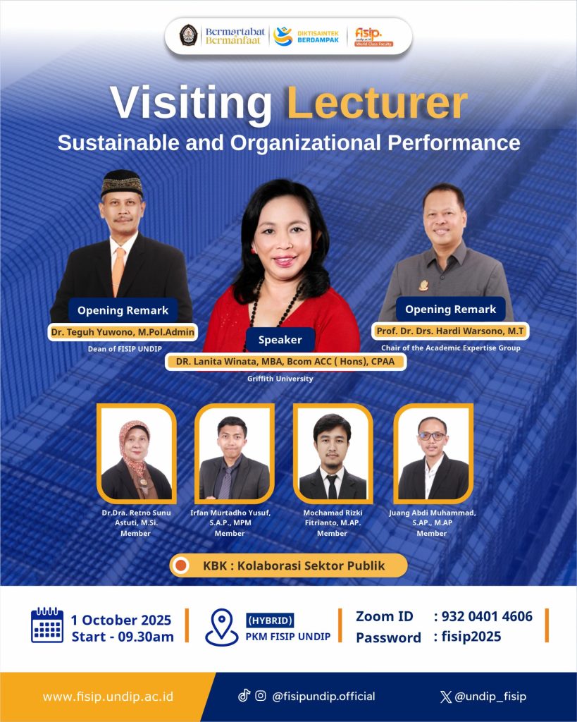 Semarang, October 1, 2025 — The Faculty of Social and Political Sciences (FISIP) at Universitas Diponegoro (Undip) has once again held a Visiting Lecturer program, featuring an international expert to strengthen academic collaboration and enrich the insights of its academic community. The event, centered on the theme “Sustainable and Organizational Performance,” was conducted in a hybrid format, taking place […]