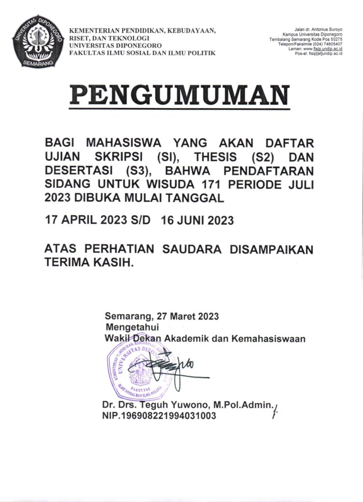 Congratulations to the New Student Candidates of the SNBP Pathway in 2023 Universitas Diponegoro. Information on qualified participants and online registration will be updated through this page. ANNOUNCEMENT WEBSITE MIRROR CLICK HERE ADMINISTRATIVE REGISTRATION AND VERIVICATION OF SNBP PATHWAY FOR THE 2023/2024 AY (online registration starts from March 30 to April 9, 2023 on page […]