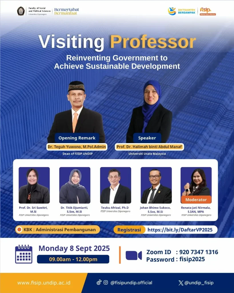 Semarang, September 8, 2025 – The Academic Expertise Cluster, Department of Public Administration, Faculty of Social and Political Sciences (FISIP), Universitas Diponegoro, successfully organized a Visiting Professor program in collaboration with Universiti Utara Malaysia (UUM). The event was held online under the theme “Reinventing Government to Achieve Sustainable Development.” The program was officially opened by […]