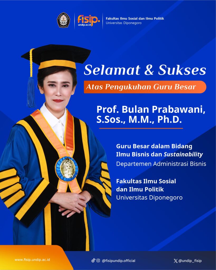 Congratulations and Success on the Inauguration of Professor Prof. Bulan Prabawani, S.Sos., M.M., Ph.D. Distinguished Professor in the field of Business and Sustainability Studies Department of Business Administration Faculty of Social and Political Sciences Universitas Diponegoro.