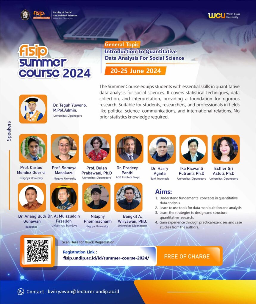 The Summer Course is designed to equip students with essential skills in analyzing quantitative data within the context of social sciences. This course offers a comprehensive introduction to statistical techniques and tools commonly used in social science research. From data collection to interpretation, participants will gain a solid foundation in quantitative analysis methods, enabling them to conduct rigorous research and draw meaningful conclusions in their respective fields. This course is suitable for undergraduate and graduate students, researchers, and professionals in social science disciplines such as political science, government studies, communications, public administration, business administration, and international relations. Participants do not need to have a basic understanding of statistics and research methodology prior to joining this course.